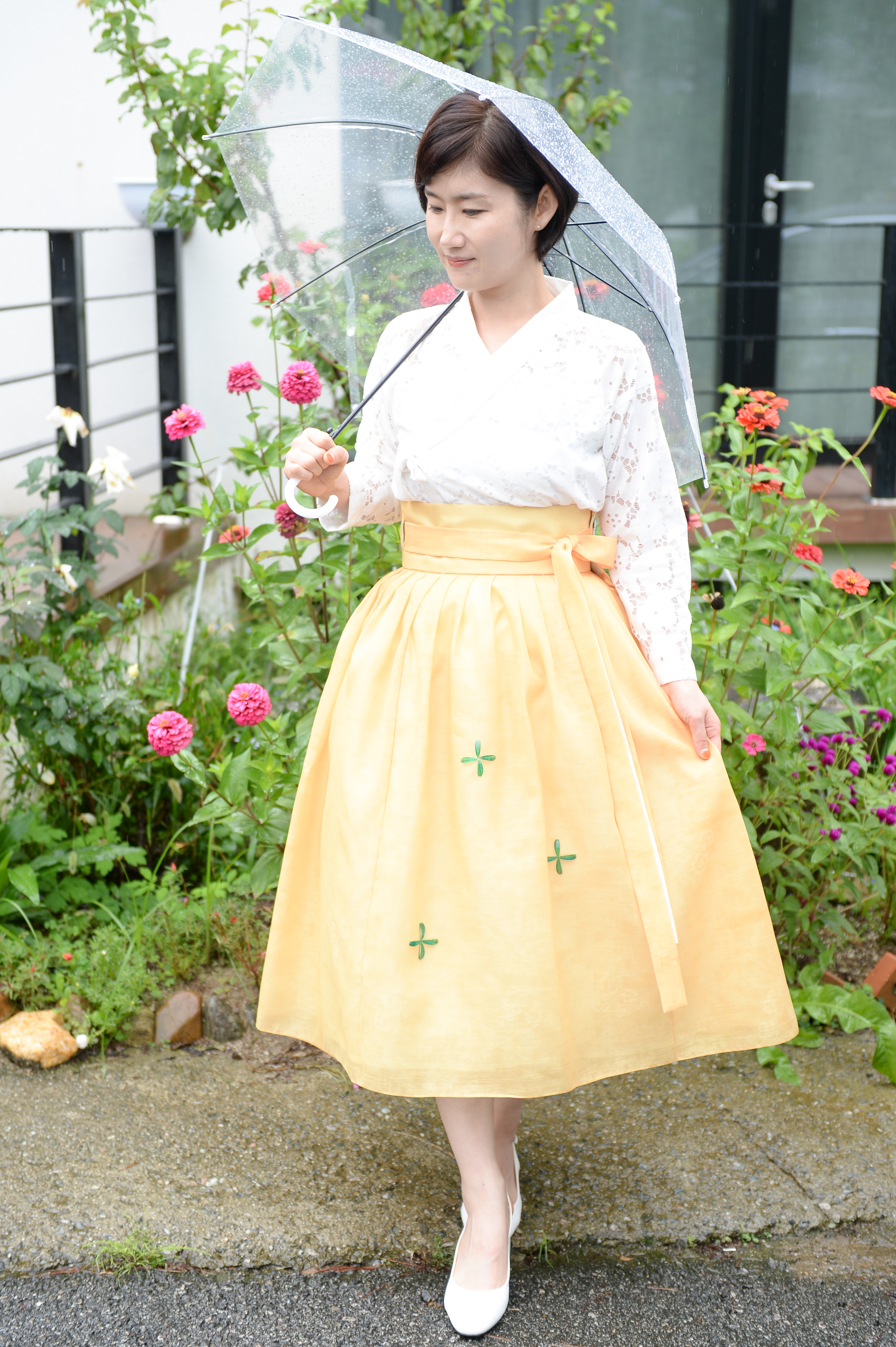 한복 치마를 리폼해서 만든 노란색 허리치마를 입고 외출을 했다.